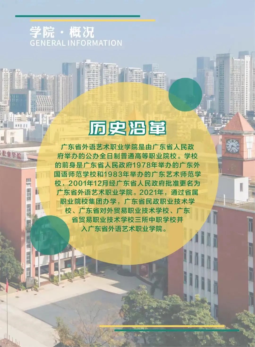 广东省外语艺术职业学院是广东省人民政府举办的全日制普通高等职业院校。学校为“广东省示范性高等职业院校”“广东省大学生创新创业教育示范学校”“广东省依法治校示范校”“广东省安全文明校园”“广东省绿色学校”。2022年9月,学校成为广东省省域高水平高等职业院校建设计划立项建设单位。